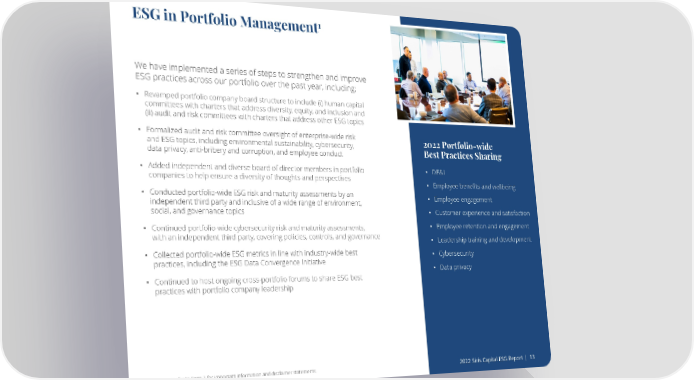 1 ESG in Portfolio Management We have implemented a series of steps to strengthen and improve ESG practices across our portfolio over the past year, including: • Revamped portfolio company board structure to include (i) human capital committees with charters that address diversity, equity, and inclusion and (ii) audit and risk committees with charters that address other ESG topics • Formalized audit and risk committee oversight of enterprise-wide risk 2022 Portfolio-wide and ESG topics, including environmental sustainability, cybersecurity, Best Practices Sharing data privacy, anti-bribery and corruption, and employee conduct • Added independent and diverse board of director members in portfolio • DE&I companies to help ensure a diversity of thoughts and perspectives • Employee benefits and wellbeing • Conducted portfolio-wide ESG risk and maturity assessments by an • Employee engagement independent third party and inclusive of a wide range of environment, social, and governance topics • Customer experience and satisfaction • Continued portfolio-wide cybersecurity risk and maturity assessments, • Employee retention and engagement with an independent third party, covering policies, controls, and governance • Leadership training and development • Collected portfolio-wide ESG metrics in line with industry-wide best • Cybersecurity practices, including the ESG Data Convergence Initiative • Data privacy • Continued to host ongoing cross-portfolio forums to share ESG best practices with portfolio company leadership 1. Please refer to Page 2 for important information and disclaimer statements. 2022 Siris Capital ESG Report | 13