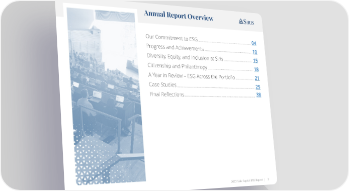 Annual Report Overview Our Commitment to ESG 04 Progress and Achievements 10 Diversity, Equity, and Inclusion at Siris 15 Citizenship and Philanthropy 18 A Year in Review – ESG Across the Portfolio 21 Case Studies 25 Final Reflections 38 2022 Siris Capital ESG Report | 3
