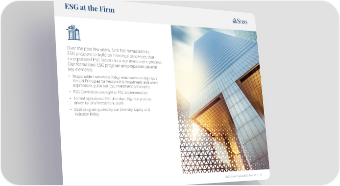 ESG at the Firm Over the past few years, Siris has formalized its ESG program to build on historical processes that incorporated ESG factors into our investment process. Our formalized ESG program encompasses several key elements: • Responsible Investment Policy, which seeks to align with the UN Principles for Responsible Investment, and where appropriate, guide our ESG investment philosophy • ESG Committee oversight of ESG implementation • Formal operational ESG deal due diligence process, driven by Siris’ investment team • DE&I program guided by our Diversity, Equity, and Inclusion Policy 2022 Siris Capital ESG Report | 11