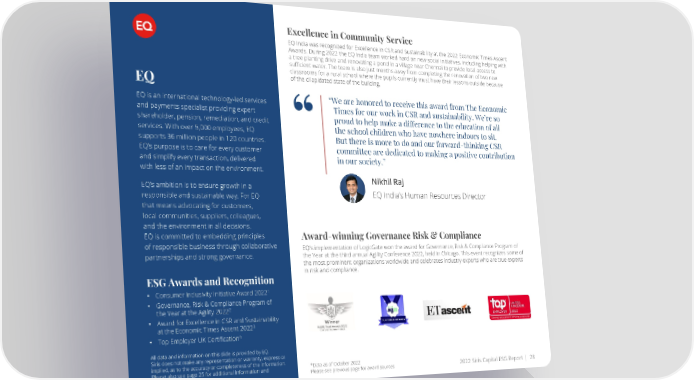 Excellence in Community Service EQ India was recognized for Excellence in CSR and Sustainability at the 2022 Economic Times Ascent Awards. During 2022 the EQ India team worked hard on new social initiatives, including helping with a tree planting drive and renovating a pond in a village near Chennai to provide local access to sufficient water. The team is also just months away from completing the renovation of two new classrooms for a rural school where the pupils currently must have their lessons outside because EQ of the dilapidated state of the building. EQ is an international technology-led services “We are honored to receive this award from The Economic and payments specialist providing expert Times for our work in CSR and sustainability. We’re so shareholder, pension, remediation, and credit proud to help make a difference to the education of all services. With over 5,000 employees, EQ the school children who have nowhere indoors to sit. supports 36 million people in 120 countries. But there is more to do and our forward-thinking CSR EQ’s purpose is to care for every customer committee are dedicated to making a positive contribution and simplify every transaction, delivered in our society.” with less of an impact on the environment. EQ’s ambition is to ensure growth in a Nikhil Raj responsible and sustainable way. For EQ EQ India’s Human Resources Director that means advocating for customers, local communities, suppliers, colleagues, and the environment in all decisions. EQ is committed to embedding principles Award-winning Governance Risk & Compliance of responsible business through collaborative EQ's implementation of LogicGate won the award for Governance, Risk & Compliance Program of partnerships and strong governance. the Year at the third annual Agility Conference 2022, held in Chicago. This event recognizes some of the most prominent organizations worldwide and celebrates industry experts who are true experts ESG Awards and Recognition in risk and compliance. 1 • Consumer Inclusivity Initiative Award 2022 • Governance, Risk & Compliance Program of 2 the Year at the Agility 2022 • Award for Excellence in CSR and Sustainability 3 at the Economic Times Ascent 2022 4 • Top Employer UK Certification All data and information on this slide is provided by EQ. Siris does not make any representation or warranty, express or implied, as to the accuracy or completeness of the information. *Data as of October 2022 Please also see page 25 for additional information and Please see previous page for award sources 2022 Siris Capital ESG Report | 28 disclaimers.