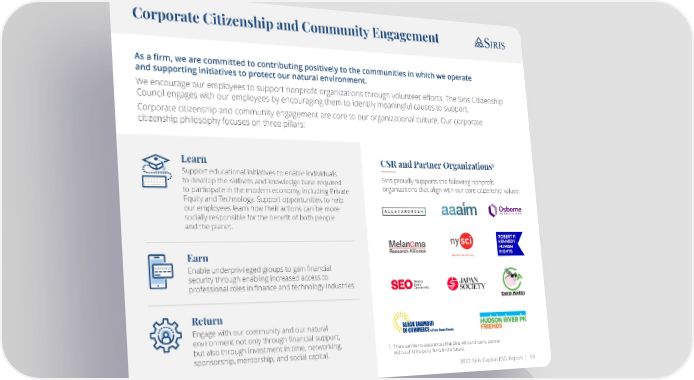 Corporate Citizenship and Community Engagement As a firm, we are committed to contributing positively to the communities in which we operate and supporting initiatives to protect our natural environment. We encourage our employees to support nonprofit organizations through volunteer efforts. The Siris Citizenship Council engages with our employees by encouraging them to identify meaningful causes to support. Corporate citizenship and community engagement are core to our organizational culture. Our corporate citizenship philosophy focuses on three pillars: Learn 1 CSR and Partner Organizations Support educational initiatives to enable individuals Siris proudly supports the following nonprofit to develop the skillsets and knowledge base required organizations that align with our core citizenship values: to participate in the modern economy, including Private Equity and Technology. Support opportunities to help our employees learn how their actions can be more socially responsible for the benefit of both people and the planet. Earn Enable underprivileged groups to gain financial security through enabling increased access to professional roles in finance and technology industries. Return Engage with our community and our natural environment not only through financial support, but also through investment in time, networking, 1. There can be no assurances that Siris will continue to partner sponsorship, mentorship, and social capital. with such third-party firms in the future. 2022 Siris Capital ESG Report | 19