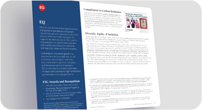 Commitment to Carbon Reduction During 2022 EQ published a carbon reduction plan and adopted carbon reduction targets in line with the Paris Agreement, committing to an absolute carbon reduction for the whole of EQ Group of 46.2% by 2029. This target supports keeping global temperatures below 1.5c, compared to pre-industrial levels. EQ has also committed EQ to achieving net zero across scope 1, 2 and 3 emissions by 2040. EQ is an international technology-led services and payments specialist providing expert Diversity, Equity, & Inclusion shareholder, pension, remediation, and credit EQ was awarded Top Employer status in the UK for 2022, exceeding benchmark scores throughout services. With over 5,000 employees, EQ the Diversity & Inclusion section. Additionally, EQ was named as a finalist for ‘Best Diversity & supports 36 million people in 120 countries. Inclusion Strategy’ at the prestigious HR Excellence Awards 2022. EQ’s purpose is to care for every customer EQ received the Consumer Inclusivity Initiative Award at the Public Trust Awards 2022 from the and simplify every transaction, delivered Chartered Insurance Institute. The award recognized EQ’s achievements in delivering products with less of an impact on the environment. and services that are accessible to all. EQ delivered customer training to more than 600 frontline colleagues, helping them identify vulnerabilities and updating our Compendia Touch software to record vulnerable customer needs, including how a member wants to interact with the company. EQ’s ambition is to ensure growth in a EQ has four employee led networks (Gender, Multicultural, LGBT+, Disability & Mental Health). responsible and sustainable way. For EQ An Executive Sponsor and the D&I Council provide oversight to each network. Today there are more that means advocating for customers, than 300 active members and D&I became a staple of EQ’s communications narrative. The EQ local communities, suppliers, colleagues, networks help embed D&I into the Company’s corporate values. For example, the EQ multicultural and the environment in all decisions. network consulted with the business in its response to the issues raised by Black Lives Matter. EQ is committed to embedding principles of responsible business through collaborative partnerships and strong governance. 1. Consideration for the Consumer Inclusivity Initiative Award 2022 was based on the 2020-2021 time period. The award ESG Awards and Recognition required an application and an application fee of less £500. Award recipients were chosen on September 15, 2022 by the Chartered Insurance Institute based on criteria listed here (CII Public Trust Awards - Award categories). 1 • Consumer Inclusivity Initiative Award 2022 2. Consideration for the Governance, Risk & Compliance Program of the Year at the Agility 2022 was based on the calendar • Governance, Risk & Compliance Program of year of 2022. The award required an application but did not require an application fee. Award recipients were chosen 2 on September 23, 2022, LogicGate, Inc. based an open voting process. the Year at the Agility 2022 • Award for Excellence in CSR and Sustainability 3. Consideration for the Award for Excellence in CSR and Sustainability at the Economic Times Ascent 2022 was based 3 on the 2021-2022 time period. The award required an application and an application fee of INR 70,000. Award recipients at the Economic Times Ascent 2022 were chosen on September 21, 2022 by FUN AND JOY AT WORK (funandjoyatwork.com) based on a review of the 4 • Top Employer UK Certification application and materials provided. All data and information on this slide is provided by EQ. 4. Consideration for Top Employer UK Certification was based on the calendar year of 2021. The award required an Siris does not make any representation or warranty, express or application and an application fee. Award recipients were chosen in January 2022 by the Top Employers Institute implied, as to the accuracy or completeness of the information. based on a questionnaire and independent audit. Please also see page 25 for additional information and *Data as of October 2022 2022 Siris Capital ESG Report | 27 disclaimers.