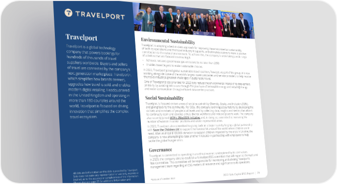 Travelport Environmental Sustainability Travelport is adopting a best-in-class approach for improving the environmental sustainability Travelport is a global technology of both its operations and the travel industry it supports, and ultimately aspires to make a positive company that powers bookings for contribution to the natural environment. To achieve this, the company is undertaking a wide range of activities that are focused on ensuring it: hundreds of thousands of travel • Achieves net zero greenhouse gas emissions by no later than 2050 suppliers worldwide. Buyers and sellers • Enables travel buyers to make sustainable choices of travel are connected by the company’s In 2022, Travelport joined global sustainable travel coalition, Travalyst. As part of the group, it is now next generation marketplace, Travelport+, working alongside some of the world’s largest travel companies and service providers to help resolve the travel industry’s greatest challenges in sustainable travel. which simplifies how brands connect, One of Travelport's top priorities for 2023 is to reduce the environmental impact of its data centers, upgrades how travel is sold, and enables primarily by avoiding emissions through the purchase of renewable energy and reducing energy modern digital retailing. Headquartered and water consumption through efficient data center practices. in the United Kingdom and operating in Social Sustainability more than 180 countries around the Travelport is focused on two areas of social sustainability: Diversity, Equity, and Inclusion (DE&I), world, Travelport is focused on driving and giving back to the community. For DE&I, the company is driving accountability by developing the innovation that simplifies the complex skillsets and mindsets of people at all levels and by collecting data, insights and metrics that allow it travel ecosystem. to continually learn and develop a truly diverse workforce and inclusive place to work. The company also recently joined IATA’s 25by2025 initiative and, in doing so, committed to increasing the number of women in senior positions and under-represented areas. In 2022, Travelport also committed to giving back on a larger scale by forging a global partnership with Save the Children UK to support the hardest hit areas of the world where children are in need. After an initial $100,000 donation to support children impacted by the crisis in Ukraine, the company is now attempting to raise another $100,000 in partnership with employees to help tackle the global hunger crisis. Governance Travelport is committed to operating in an ethical manner, underpinned by its core values. In 2023, the company aims to establish a formalized ESG committee that will report to the Audit and Risk Committee. This committee will be responsible for monitoring and advising Travelport’s All data and information on this slide is provided by Travelport. management team regarding all ESG matters of relevance and significance to its operations. Siris does not make any representation or warranty, express or implied, as to the accuracy or completeness of the information. Please also see page 25 for additional information and *Data as of October 2022 2022 Siris Capital ESG Report | 29 disclaimers.