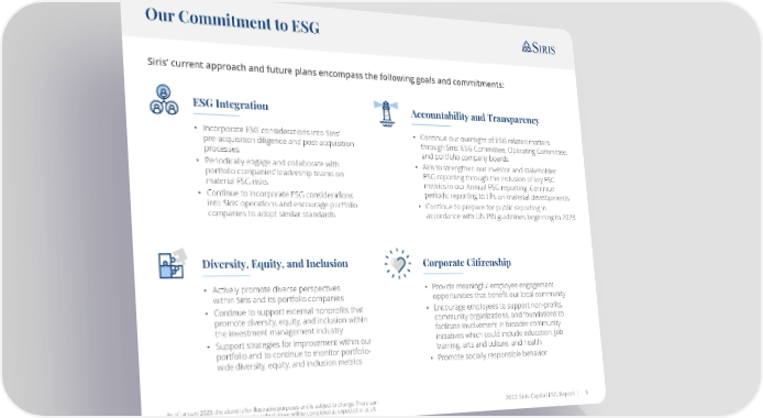 Our Commitment to ESG Siris’ current approach and future plans encompass the following goals and commitments: ESG Integration Accountability and Transparency • Incorporate ESG considerations into Siris’ • Continue our oversight of ESG related matters pre-acquisition diligence and post-acquisition through Siris’ ESG Committee, Operating Committee, processes and portfolio company boards • Periodically engage and collaborate with • Aim to strengthen our investor and stakeholder portfolio companies’ leadership teams on ESG reporting through the inclusion of key ESG material ESG risks metrics in our Annual ESG reporting. Continue • Continue to incorporate ESG considerations periodic reporting to LPs on material developments into Siris’ operations and encourage portfolio • Continue to prepare for public reporting in companies to adopt similar standards accordance with UN PRI guidelines beginning in 2023 Diversity, Equity, and Inclusion Corporate Citizenship • Actively promote diverse perspectives • Provide meaningful employee engagement w opportunities that benefit our local community ithin Siris and its portfolio companies • Continue to support external nonprofits that • Encourage employees to support non-profits, promote diversity, equity, and inclusion within community organizations, and foundations to the investment management industry facilitate involvement in broader community • Support strategies for improvement within our initiatives which could include education, job portfolio and to continue to monitor portfolio- training, arts and culture, and health wide diversity, equity, and inclusion metrics • Promote socially responsible behavior As of January 2023, the above is for illustrative purposes and is subject to change. There can 2022 Siris Capital ESG Report | 9 be no assurance that the initiatives described above will be completed as expected or at all.