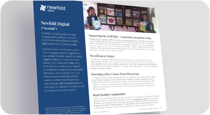 Newfold Digital (“Newfold”) Newfold is a leading web technology Supporting the LGBTQIA+ Community around the Globe company serving millions of small to Newfold proudly supports LGBTQIA+ across our global communities. In April 2022, the Jacksonville, medium businesses globally to build a Florida Newfold team generously supported the 2022 Strides for Pride, a fun filled 5k to benefit digital presence that delivers results. JASMYN. JASMYN is a non-profit organization that empowers LGBTQIA+ youth through leadership, advocacy, resources and a safe and confirming community. In August, the Newfold Digital’s team in Wijchen, The Netherlands celebrated Pride together from their well decorated boat as a floating Newfoldbelieves in fostering a culture participant in the Amsterdam Pride Canal Pride! that encourages everyone regardless of We will never Forget race, gender, ethnicity, sexual orientation, religious affiliation, or social economic In April 2022, nearly 200 Newfold employees joined together in a virtual event hosted by the background to feel comfortable being Jewish@Newfold Affinity Group and the United States Holocast Memorial Museum. During the event, attendees had a once-in-a-lifetime opportunity to hear from Holocaust survivor Rae Goldfarb their authentic selves at work. Newfold as she shared stories about her childhook in Doksyca, Poland, life under Nazi rule and her eventual is committed to embracing its employees’ escape from a Jewish ghetto. differences and creating an open and Parenting with a Career Panel Discussion inclusive environment that will help In recognition of the unique challenges faced by working Parents, the Parents@Newfold affinity everyone achieve their full potential, group hosted an optional event for Newfold team members. Hosted in September as many and ultimately help bring about positive employees faced the start of another school year, this interactive event was designed to offer outcomes for colleagues, customers, and support and advice on a myriad of topics including nutrition, managing unexpected school closures, and dealing with traditional milestones such as starting kindergarten or graduating the communities they represent. from high school. Heart Healthy Communities In May 2022, the Newfold Jacksonville team sponsored an American Heart Association's Go Red for in the No. 1 killer Women luncheon in Jacksonville. According to the AHA, “cardiovascular disease of women, but the simple truth is that most cardiovascular diseases can still be prevented with All data and information on this slide is provided by Newfold. education and healthy lifestyle changes.” The Newfold team was honored to step up to provide Siris does not make any representation or warranty, express or an opportunity for women in their local community to learn how to improve their health. implied, as to the accuracy or completeness of the information. Please also see page 25 for additional information and *Data as of October 2022 2022 Siris Capital ESG Report | 34 disclaimers.