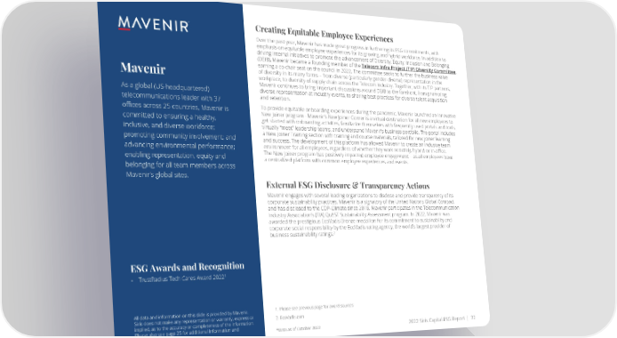 Creating Equitable Employee Experiences Over the past year, Mavenir has made great progress in furthering its ESG commitments, with emphasis on equitable employee experiences for its growing and hybrid workforce. In addition to driving internal initiatives to promote the advancement of Diversity, Equity, Inclusion and Belonging (DEIB), Mavenir became a founding member of the Telecom Infra Project (TIP) Diversity Committee, earning a co-chair seat on the council in 2022. The committee seeks to further the business value Mavenir of diversity in its many forms – from diverse (particularly gender-diverse) representation in the workplace, to diversity of supply chain across the Telecom industry. Together, with its TIP partners, Mavenircontinues to bring important discussions around DEIB to the forefront, from promoting As a global (US-headquartered) diverse representation at industry events, to sharing best practices for diverse talent acquisition telecommunications leader with 37 and retention. offices across 25 countries, Mavenir is To provide equitable onboarding experiences during the pandemic, Mavenir launched an innovative committed to ensuring a healthy, New Joiner program - Mavenir’s New Joiner Corner is a virtual destination for all new employees to get started with onboarding activities, familiarize themselves with frequently used portals and tools, inclusive, and diverse workforce; virtually “meet” leadership teams, and understand Mavenir’s business portfolio. The portal includes promoting community involvement; and a New Joiner Training section with training and course materials, tailored for new joiner learning and success. The development of this platform has allowed Mavenir to create an inclusive team advancing environmental performance; environment for all employees, regardless of whether they work remotely, hybrid or in-office. enabling representation, equity and The New Joiner program has positively impacted employee engagement – as all employees have a centralized platform with common employee experiences and events. belonging for all team members across Mavenir’s global sites. External ESG Disclosure & Transparency Actions Mavenirengages with several leading organizations to disclose and provide transparency of its corporate sustainability practices. Mavenir is a signatory of the United Nations Global Compact and has disclosed to the CDP-Climate since 2018. Mavenir participates in the Telecommunication Industry Association’s (TIA) QuEST Sustainability Assessment program. In 2022, Mavenir was awarded the prestigious EcoVadis Bronze medallion for its commitment to sustainability and corporate social responsibility by the EcoVadis rating agency, the world’s largest provider of business sustainability ratings.2 ESG Awards and Recognition • TrustRadius Tech Cares Award 20221 All data and information on this slide is provided by Mavenir. 1. Please see previous page for award sources Siris does not make any representation or warranty, express or 2. EcoVadis.com implied, as to the accuracy or completeness of the information. Please also see page 25 for additional information and *Data as of October 2022 2022 Siris Capital ESG Report | 32 disclaimers.