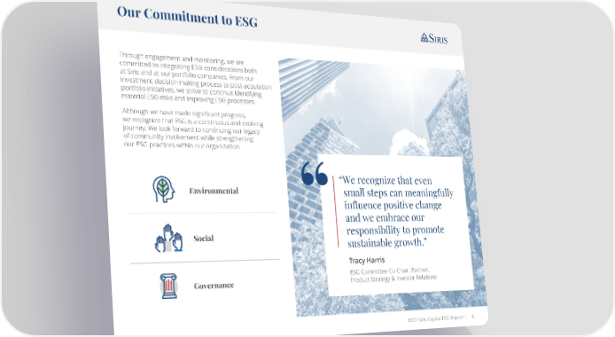 Our Commitment to ESG Through engagement and monitoring, we are committed to integrating ESG considerations both at Siris and at our portfolio companies. From our investment decision making process to post-acquisition portfolio initiatives, we strive to continue identifying material ESG risks and improving ESG processes. Although we have made significant progress, we recognize that ESG is a continuous and evolving journey. We look forward to continuing our legacy of community involvement while strengthening our ESG practices within our organization. “We recognize that even Environmental small steps can meaningfully influence positive change and we embrace our Social responsibility to promote sustainable growth.” Tracy Harris ESG Committee Co-Chair, Partner, Governance Product Strategy & Investor Relations 2022 Siris Capital ESG Report | 8